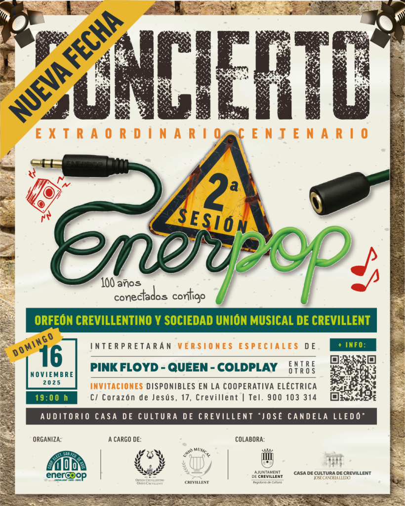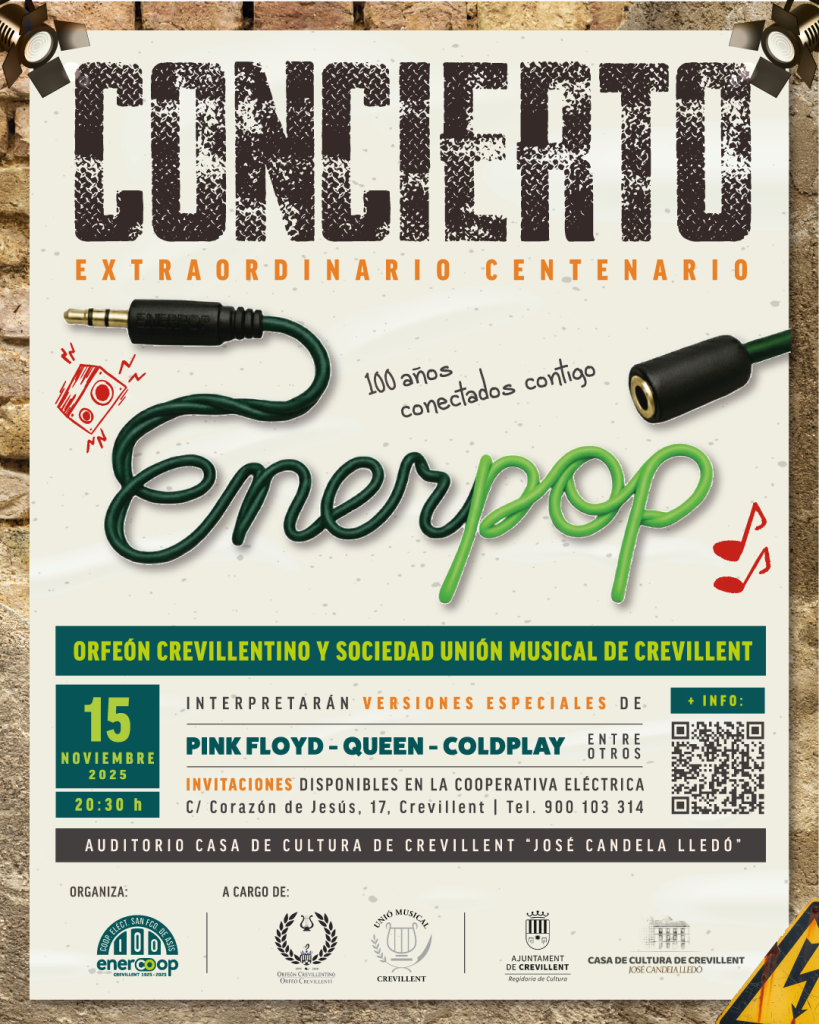 En el marco de la celebración de su centenario, la Cooperativa Eléctrica Benéfica San Francisco de Asís ha organizado el gran concierto extraordinario «Enerpop», en el que participarán el Orfeón Crevillentino y la Sociedad Unión Musical de Crevillent, que interpretarán versiones especiales de algunas de las canciones más destacadas del pop y rock nacional e internacional de las últimas décadas.
