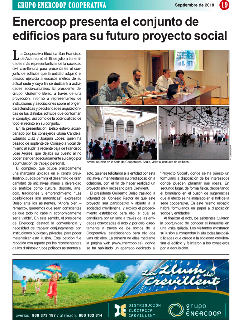A lo largo de sus cien años de historia, la Cooperativa Eléctrica de Crevillent ha sido protagonista de numerosos acontecimientos que han marcado el devenir de la localidad. Su labor pionera en el suministro eléctrico y su compromiso con el progreso han sido ampliamente reconocidos por los medios de comunicación.